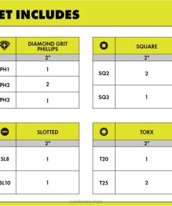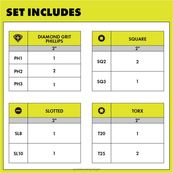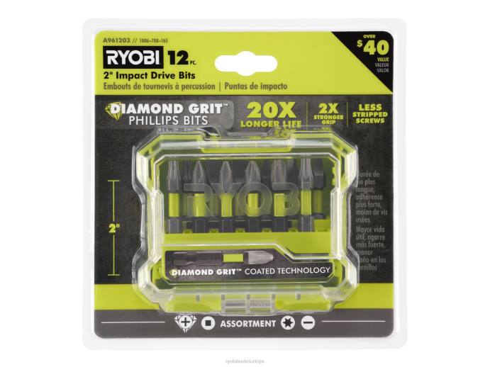 alet koleksiyonunuzu ryobi elmas grit kaplama teknolojisiyle tamamlayın. bu 12 adet. 2″ elmas darbeli tahrik uçları, elmas kaplamalı darbeli yıldız uçları ve ilave darbe dayanımlı tahrik uçlarını içerir. Elmas taneciği kaplı teknoloji, 20 kat daha uzun ömür için ek bir koruma katmanı sağlayarak, tüm yıldız vidalama uygulamalarında uç dayanıklılığını artırır. Elmas taneciği, 2 kat daha güçlü kavrama, sürüş öncesi güçlü bir tutuşa ve bağlantı elemanının uca oturmasına olanak tanır. Bu ilave kavrama, manyetik olarak yüklenmiş bir uçla benzer bir deneyim yaratır, ancak daha güvenli bir tutuş sağlar. elmas kum kaplı teknoloji, yıldızları kavrar Phillips kafasının soyulmasını önlemek amacıyla sürüş uygulamaları sırasında daha iyi uyum sağlamak için bağlantı elemanı.seti profesyonel ve diyer ihtiyaçlarını karşılayabilecek çok çeşitli sürüş çözümleri sunuyor. bu 12 adet. 2″ darbeli matkap uçları standart matkaplar ve darbeli matkaplarla uyumludur ve şunları içerir: (1) 2″ elmas ph1, (2) 2″ elmas ph2, (1) 2″ elmas ph3, (1) t20, (2) t25, ( 1) sl8, (1) sl10 , (2) sq2 ve (1) sq3.