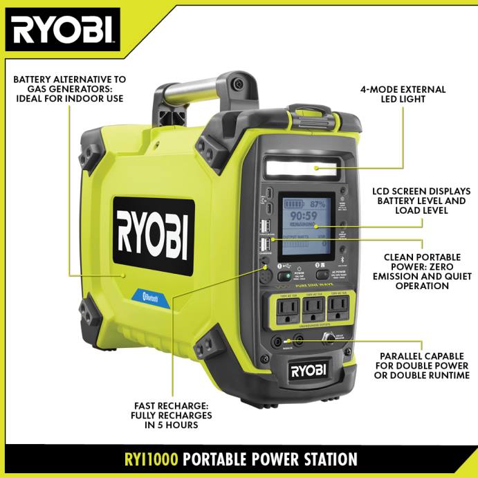 Ryobi 1800 watt taşınabilir güç istasyonu, dahili 1094 watt saatlik pilini kullanarak 1800 çalışma watt’ı ve 3000 başlangıç watt’lık temiz, taşınabilir güç sağlar. İster şantiyede olun, ister uzak bir bölgede kamp yapın, ister elektrik kesintisi sırasında evinizde olun, bu güç istasyonu cihazlarınızı çalışır durumda tutmak için mükemmeldir. bu ünite cep telefonları, dizüstü bilgisayarlar, ışıklar ve hatta televizyonlar ve buzdolapları gibi cihazlara güç sağlayabilir. Tam boyutlu bir buzdolabına 18 saate kadar veya 32″ LED TV’ye 30 saate kadar güç sağlar. Sessiz çalışma ve sıfır emisyon özelliğine sahip bu güç istasyonu, iç mekan kullanımı için güvenlidir. Saf sinüs dalgası teknolojisi, temiz güç çıkışı sağlayarak uyumluluk sağlar hassas elektronik cihazlara güç vermenin yanı sıra ünitenin dahili pilini de şarj edin.Aynı zamanda geçişli şarj teknolojisi ile. gencontrol uygulamasını kullanarak güç istasyonunun watt çıkışını ve pil seviyesini akıllı telefonunuzdan rahatlıkla izleyin. ryi1000 taşınabilir güç istasyonu 3 yıllık üretici garantisiyle desteklenmektedir ve güç istasyonunu, 270 watt ac şarj cihazını, koruyucu kapağı ve kullanım kılavuzlarını içerir.