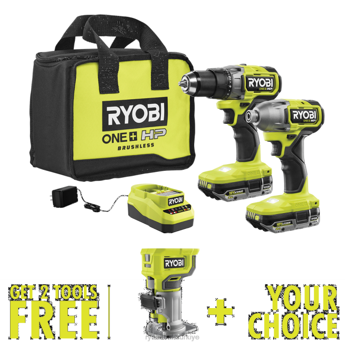 RYOBI 18v one+ hp fırçasız 2 araçlı kombo kit, ücretsiz 18v one+ kompakt yönlendirici ve ücretsiz tercih edilen araçla birlikte PLZ211
