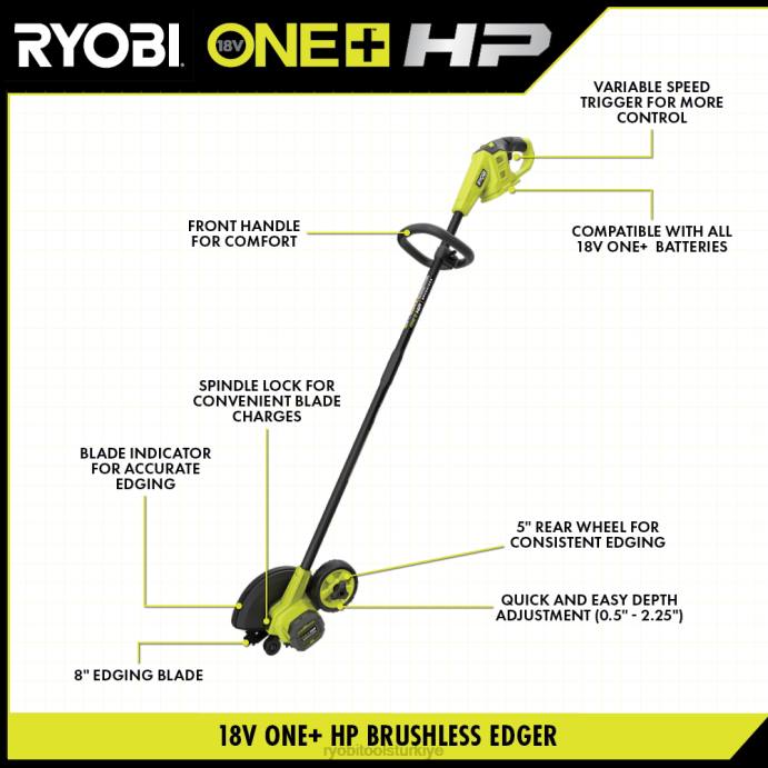 ryobi 18v one+ sisteminizi 18v one+ hp fırçasız kenar kesme kitiyle geliştirin. one+ hp teknolojisi, fırçasız motorları, gelişmiş elektronikleri ve yüksek performanslı lityum teknolojisini kullanarak daha fazla güç, çalışma süresi, dayanıklılık ve hız sunar. %60 daha fazla devir sağlayan bu kenar kesme makinesi, işi 2 kat daha uzun çalışma süresiyle hızlı ve verimli bir şekilde tamamlamanıza olanak tanır. kenar araba yolları, kaldırımlar ve çiçek tarhları size mükemmel bakımlı bir çim sağlar. Tercihinize bağlı olarak 8” çelik kenarlı bıçağın derinliğini 0,5” ila 2,25” arasında kolayca ayarlayın. En doğru kenar düzeltmesi için, temiz kesimler sağlamak amacıyla bıçak göstergesini kullanın. Bu kenar kesme makinesi, tutarlı kenar düzeltme için 5 inçlik bir arka tekerleğe ve üstün kontrol için değişken hızlı bir tetikleyiciye ve ön tutamağa sahiptir. Bıçağı değiştirme zamanı geldiğinde, hızlı bir şekilde değiştirmek için mil kilidini kullanın.ve uygun değişiklikler. hepsinden iyisi, herhangi bir 18v one+ pilin herhangi bir 18v one+ ürünle çalıştığı ryobi one+ sisteminin bir parçasıdır. 18v one+ hp fırçasız kenar kesme seti, ryobi 3 yıllık üretici garantisiyle desteklenir ve p2302 18v one+ hp fırçasız kenar kesme makinesi, pbp005 18v one+ 4ah pil, pcg002 18v one+ şarj cihazı, bıçak anahtarı ve kullanım kılavuzlarını içerir.