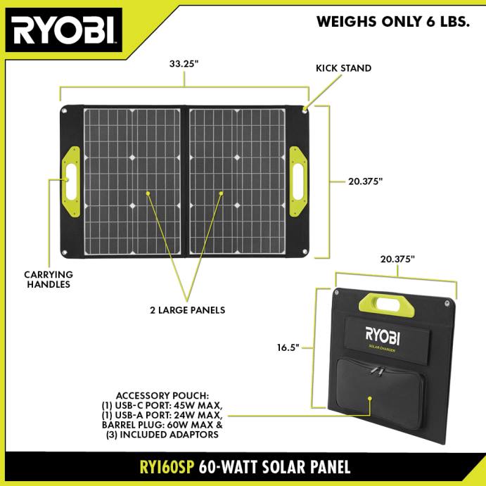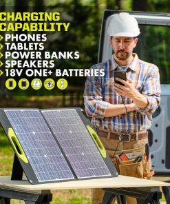 ryobi 60 watt katlanabilir güneş paneli, usb-a veya usb-c bağlantı noktasına sahip her türlü küçük elektronik cihaza doğrudan güneşten güç sağlar. Daha fazla uyumluluk için, aynı zamanda namlu fiş konnektörü ve adaptörleri ile çeşitli diğer elektronik cihazlara da güç sağlar. Uyumlu bir ryobi güç kaynağıyla birleştirildiğinde telefonlarınıza, tabletlerinize, güç bankalarınıza, hoparlörlerinize ve hatta ryobi 18v one+ pillerinize güç sağlamak için idealdir. Güneş enerjisi kullanarak art arda 8 pili şarj etmek için ryobi 18v one+ ryi818bg güç istasyonuyla eşleştirin. Bu güneş paneli, ryobi 18v one+ 2ah pili 1 saatten kısa sürede ve telefonunuzu 1 saat 15 dakika kadar kısa bir sürede şarj edebilir. Kompakt, katlanabilir tasarım, depolamayı ve taşımayı kolaylaştırır, böylece kamp yaparken cihazlarınızı şarj etmek için yanınıza alabilirsiniz.Bir şantiyede ve taşınabilir güce ihtiyaç duyacağınız güneşin altındaki her yerde. Serbestçe ayarlanabilen destek çubuğunu veya (4) güvenli rondelaları kullanarak panellerin yakaladığı ışık miktarını en üst düzeye çıkarın. ryobi 60 watt güneş paneli, ryobi 3 yıllık üretici garantisiyle desteklenir ve ryi60sp 60 watt katlanabilir güneş panelini, namlu fiş adaptörlerini ve bir kullanım kılavuzunu içerir.