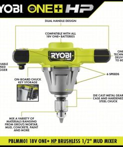 RYOBI 18v one+ hp fırçasız 1/2 çamur karıştırıcı seti PLZ2191