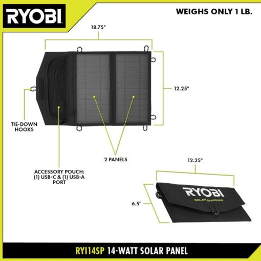 ryobi 14 watt’lık katlanabilir güneş paneli, usb-a veya usb-c bağlantı noktasına sahip her türlü küçük elektronik cihaza doğrudan güneşten güç sağlar. Uyumlu bir ryobi güç kaynağıyla birleştirildiğinde telefonlarınıza, tabletlerinize, güç bankalarınıza, hoparlörlerinize ve hatta ryobi 18v one+ pillerinize güç sağlamak için idealdir. ryobi 18v one+ 2ah pili 4 saatten kısa sürede, telefonunuzu ise 2 saat 20 dakika kadar kısa bir sürede şarj edebilir. 14 watt’lık güneş paneli, yalnızca 1 pound ağırlığında ve katlandığında 12,15” x 6,5” ölçüleriyle güç kaynağınızın taşınabilirliğini en üst düzeye çıkarır. Kompakt, hafif, katlanabilir tasarım, depolamayı ve taşımayı kolaylaştırır; böylece yürüyüş yaparken, kamp yaparken, plajda ve güneşin altında taşınabilir güce ihtiyaç duyduğunuz her yerde cihazlarınızı şarj etmek için yanınıza alabilirsiniz. olabilirGüneş ışığının yoğun olduğu saatlerde ışığı yakalamak için yere düz olarak yerleştirilebilir veya yakaladığı ışık miktarını en üst düzeye çıkarmak için (7) entegre asma halkaları kullanılarak çeşitli açılarda asılabilir. ryobi 14 watt güneş paneli, ryobi 3 yıllık üretici garantisiyle desteklenir ve ryi14sp 14 watt katlanabilir güneş paneli ve bir kullanım kılavuzu içerir.
