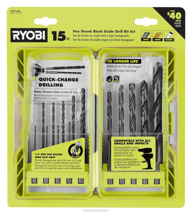 ryobi, 15 parçalı siyah oksit altıgen saplı matkap ucu setini tanıtıyor. Bu delme ucu çeşitleri ahşap, metal ve plastik yüzeyler de dahil olmak üzere çeşitli malzemeler için mükemmeldir. Uçlar, üstün dayanıklılık ve 3 kat daha uzun ömür sunmak için siyah oksit kaplamalı yüksek hız çeliğinden yapılmıştır. Bu uçların bir başka özelliği de temas halinde delmek ve ucunuzun yürümesini önlemek için 135 derecelik ayrılma noktasıdır. 1/4″ altıgen tasarım, ucun kaymasını önlemek için mandren içinde güvenli bir tutuş sağlar. 1/4″ altıgen tasarımlar, matkap ve tahrik uçları arasında hızlı değişiklik yapmak için ucun kolay çıkarılmasını sağlar. Uçlara kolay erişim ve hareket kabiliyeti için kompakt kasa. 1/16″ ile 1/2″ arasında değişen bu geniş ürün yelpazesi, projenizin tüm ihtiyaçlarını karşılayacak bir parçayı garanti eder. bu set dahil(2) 1/16″ siyah oksit matkap ucu, (1) 5/64″ siyah oksit matkap ucu, (1) 3/32″ siyah oksit matkap ucu, (1) 7/64″ siyah oksit matkap ucu, ( 2) 1/8″ siyah oksit matkap ucu, (1) 9/64″ siyah oksit matkap ucu, (1) 5/32″ siyah oksit matkap ucu, (1) 3/16″ siyah oksit matkap ucu, (1) 7/32″ siyah oksit matkap ucu, (1) 1/4″ siyah oksit matkap ucu, (1) 5/16″ siyah oksit matkap ucu, (1) 3/8″ siyah oksit matkap ucu ve (1) 1 /2″ siyah oksit matkap ucu