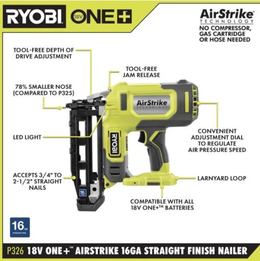 ryobi, 1,5 ah pil ve şarj cihazıyla birlikte 18v one+ 16 kalibre kablosuz hava saldırılı son işlem çivi çakma makinesini tanıtıyor. Bu son çivi çakma makinesi, gürültülü kompresörlere, hacimli hortumlara veya pahalı gaz kartuşlarına olan ihtiyacı ortadan kaldıran hava saldırısı teknolojisine sahiptir. bu, şantiyede daha hızlı kurulum ve kolay manevra kabiliyeti anlamına gelir. Bu düz yüzeyli çivi çakma makinesi, sert ağaçlarda 2-1/2 inç’e kadar çivileri batırma kapasitesine sahiptir. Alet gerektirmeyen tahrik derinliği ayarı, çivi başlarının uygun şekilde ayarlanmasına olanak tanır. Bu çivi çakma makinesi, şarj başına 1.000’e kadar çivi batırarak uzun süreli sürekli çalışmaya olanak tanır. ayrıca p325’e kıyasla dar noktalara erişim ve üstün tahrik kalitesi için %78 daha küçük bir burun sunar. ayrıca hava basıncı hızını ayarlamak için kullanışlı bir ayar kadranı da bulunmaktadır.optimum performans. Taç kalıplama, süpürgelik ve dış kaplama için harika olan bu son çivi çakma makinesi, her marangoz veya diyer’in alet koleksiyonuna mükemmel bir katkıdır. birlikte verilen pil ve şarj cihazı tüm ryobi 18v one+ araçlarıyla uyumludur. Bu kit, ryobi 3 yıllık üretici garantisiyle desteklenmektedir ve 2 adet bozulmayan ped, 1,5 ah pil, 18v şarj cihazı ve kullanım kılavuzları içerir.