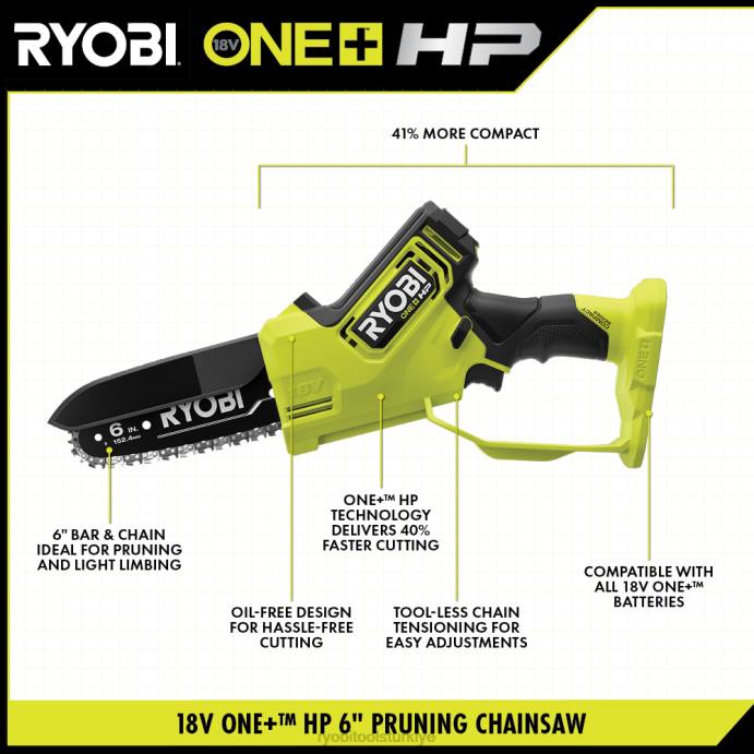 ryobi 18v one+ sisteminizi 18v one+ hp kompakt fırçasız 6” motorlu budama testeresiyle geliştirin. one+ hp teknolojisi, %40 daha hızlı kesim sağlamak için fırçasız motor, gelişmiş elektronikler ve yüksek performanslı lityum teknolojisini birleştirir. Bu budama testeresi, 2ah akü kullanıldığında şarj başına 21’e kadar kesim yapabilir. Gaz veya akor sıkıntısı olmadan, yalnızca tetiğin çekilmesiyle olağanüstü performansı deneyimleyin. 6 inçlik çubuk ve birinci sınıf tam donanımlı zincir, daha agresif kesimler, daha uzun çalışma süresi ve daha hızlı kesim sağlar. Kompakt boyutu hafiftir ve manevra yapması kolaydır; bu da onu 4 inç’e kadar hafif budama ve dal budama için ideal kılar. Bu alet, son derece rahatlık için aletsiz zincir gerdirme ve yağsız bir tasarıma sahiptir. bu testere ry6c1 6″ değiştirmeyle uyumludurMen zinciri. hepsinden iyisi, herhangi bir 18v one+ pilin herhangi bir 18v one+ ürünle çalıştığı ryobi one+ sisteminin bir parçasıdır. Bu 18v one+ hp kompakt fırçasız 6 inç motorlu budama testeresi, ryobi 3 yıllık üretici garantisiyle desteklenir ve kın ile kullanım kılavuzunu içerir.