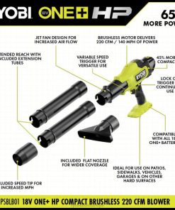 ryobi 18v one+ sisteminizi 18v one+ hp 220 cfm kompakt fırçasız üfleyici kitiyle geliştirin. ryobi one+ hp teknolojisi, güçlü bir fırçasız motor, gelişmiş elektronikler ve yüksek performanslı lityum teknolojisini birleştirerek 220 cfm ve 140 mph’ye kadar hız sağlar, bu da bu üfleyiciyi garajlar, teraslar ve araçlar gibi sert yüzeylerin üstesinden gelmek için ideal hale getirir. Kompakt aletlerimiz şimdiye kadar yaptığımız en hafif ve en küçük aletlerdir ve aynı zamanda işin yapılması için en uygun gücü sağlarlar. Bu üfleyici tamamen çok yönlülükle ilgilidir. iki uzatma tüpü, ilave 20 inç’e kadar daha fazla erişim sağlamak üzere birleştirilebilir. aynı zamanda daha fazla mil/saat için yalnızca birlikte verilen hız ucuyla veya daha geniş kapsama alanı için düz ağızlıkla da kullanılabilir. Ryobi’nin kompakt serisinin bir parçası olan bu üfleyici, p2109’dan %45 daha kompakttır ve 4 kg’dan daha hafiftirlbs. En kısa konfigürasyonunda 16 inçten daha kısa bir uzunluğa sahiptir ve kullanıcıların dar, garip alanları temizlemesine olanak tanır. Değişken hızlı tetik, hassas alanlarda size maksimum kontrol sağlar ve tetikte kilitlenme, tetiği basılı tutmadan sürekli kullanıma olanak tanır. hepsinden iyisi, ryobi one+ sisteminin bir parçasıdır; herhangi bir 18v one+ pil, herhangi bir 18v one+ ürünüyle çalışır. Bu 18v one+ hp kompakt fırçasız üfleyici ve pil, ryobi 3 yıllık üretici garantisiyle desteklenir ve psblb01 18v üfleyiciyi, pbp005 18v 4ah lityum pili, pcg002 18v şarj cihazını, (2) uzatma tüplerini, hız ucunu, düz nozulu ve operatörü içerir kılavuzlar.