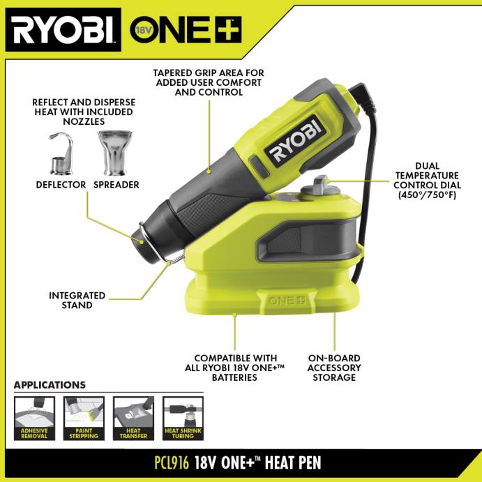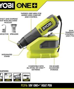 ryobi 18v one+ sisteminizi ryobi 18v one+ ısı kalemiyle genişletin. 450 derece/750 derece arasında değişen ikili sıcaklık kontrol kadranı, ısıya duyarlı malzemeyle çalışmayı kolaylaştırır. Bu 18v ısı kaleminin kompakt tasarımı, yapışkan çıkarma, boya çıkarma, ısı transferi, ısıyla daralan makaron ve daha fazlası gibi hassas uygulamalar için mükemmeldir. entegre stand, eller serbest kullanımı kolaylaştırır. Daha fazla rahatlık için yerleşik aksesuar deposunda bulunan saptırıcı ve yayıcı nozullar sayesinde ısıyı kolayca yansıtır ve dağıtır. ryobi one+ sisteminin bir parçasıdır – herhangi bir 18v one+ pil, herhangi bir 18v one+ ürünüyle çalışır. Bu 18v one+ ısı kalemi, ryobi 3 yıllık üretici garantisiyle desteklenir ve pcl916 18v one+ ısı kalemi, 18v one+ 2ah lityum pil, 18v one+ şarj cihazı, deflektör nozulu, s içeriryayma başlığı ve kullanım kılavuzu.