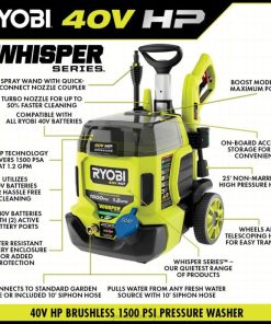 ryobi 40v hp basınçlı yıkama makinesiyle 40v sisteminizi geliştirin. gelişmiş 40v hp teknolojisi, güçlü, taşınabilir temizlik için 1.500 psi ve 1,2 gpm’ye kadar güç sağlamak üzere fırçasız bir motor, gelişmiş elektronikler ve lityum pil kullanır. gaz yok, bakım yok ve güçlük yok. Maksimum çalışma süresi için bu basınçlı yıkama makinesini 1000 psi performansa yönelik varsayılan ayarda kullanın. Nihai güce ihtiyaç duyulduğunda, güçlendirme modunda 1.500 psi’yi serbest bırakın. fırçasız motor ve lityum teknolojisi, (2) birlikte verilen 40v 6ah pillerle 25 dakikaya kadar çalışma süresi sağlar. Bu fısıltı serisi basınçlı yıkama makinesi, gazlı basınçlı yıkama makinelerinden %81 daha sessiz olacak şekilde tasarlanmıştır ve başkalarını rahatsız etmeden günün her saatinde temizlik yapmanıza olanak tanır. basınçlı yıkama makinenizi ry31012vnm 12″ yüzey temizleyici f ile geliştirinveya hızlı, iz bırakmayan temizlik, kir ve döküntülerin etkin şekilde temizlenmesi için ry31211 su süpürgesi ve kontrollü köpük deterjan dağıtımı için ry31f04 köpük püskürtücü. hepsinden iyisi, herhangi bir 40v pilin herhangi bir 40v ürünle çalıştığı ryobi 40v sisteminin bir parçasıdır. Bu 40v hp basınçlı yıkama makinesi, ryobi 5 yıllık üretici garantisiyle desteklenir ve birlikte verilen piller, 3 yıllık üretici pil garantisi kapsamındadır. bu basınçlı yıkama makinesi, ry40pw15 40v basınçlı yıkama makinesini, (2) op40605 40v 6ah lityum pilleri, tetik kolunu, püskürtme çubuğunu, 25′ bozulmayan yüksek basınç hortumunu, 10′ sifon hortumunu, nozülleri (15 derece, sabun ve turbo) içerir. kendinden emişli adaptör ve kullanım kılavuzları.