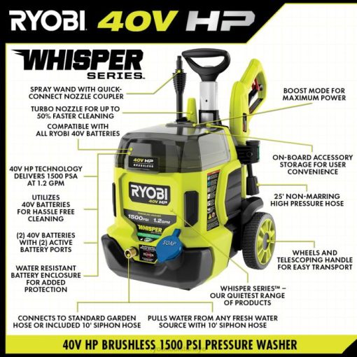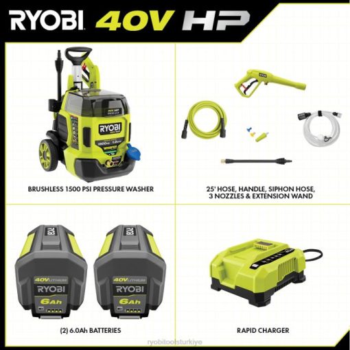 ryobi 40v hp basınçlı yıkama makinesiyle 40v sisteminizi geliştirin. gelişmiş 40v hp teknolojisi, güçlü, taşınabilir temizlik için 1.500 psi ve 1,2 gpm’ye kadar güç sağlamak üzere fırçasız bir motor, gelişmiş elektronikler ve lityum pil kullanır. gaz yok, bakım yok ve güçlük yok. Maksimum çalışma süresi için bu basınçlı yıkama makinesini 1000 psi performansa yönelik varsayılan ayarda kullanın. Nihai güce ihtiyaç duyulduğunda, güçlendirme modunda 1.500 psi’yi serbest bırakın. fırçasız motor ve lityum teknolojisi, (2) birlikte verilen 40v 6ah pillerle 25 dakikaya kadar çalışma süresi sağlar. Bu fısıltı serisi basınçlı yıkama makinesi, gazlı basınçlı yıkama makinelerinden %81 daha sessiz olacak şekilde tasarlanmıştır ve başkalarını rahatsız etmeden günün her saatinde temizlik yapmanıza olanak tanır. basınçlı yıkama makinenizi ry31012vnm 12″ yüzey temizleyici f ile geliştirinveya hızlı, iz bırakmayan temizlik, kir ve döküntülerin etkin şekilde temizlenmesi için ry31211 su süpürgesi ve kontrollü köpük deterjan dağıtımı için ry31f04 köpük püskürtücü. hepsinden iyisi, herhangi bir 40v pilin herhangi bir 40v ürünle çalıştığı ryobi 40v sisteminin bir parçasıdır. Bu 40v hp basınçlı yıkama makinesi, ryobi 5 yıllık üretici garantisiyle desteklenir ve birlikte verilen piller, 3 yıllık üretici pil garantisi kapsamındadır. bu basınçlı yıkama makinesi, ry40pw15 40v basınçlı yıkama makinesini, (2) op40605 40v 6ah lityum pilleri, tetik kolunu, püskürtme çubuğunu, 25′ bozulmayan yüksek basınç hortumunu, 10′ sifon hortumunu, nozülleri (15 derece, sabun ve turbo) içerir. kendinden emişli adaptör ve kullanım kılavuzları.