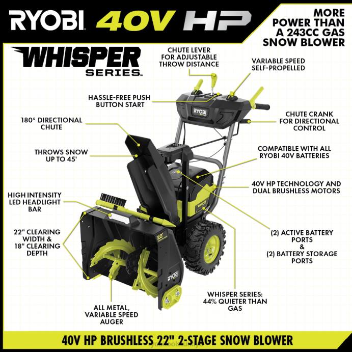 ryobi 40v hp fırçasız 22” kar püskürtme kitiyle ryobi 40v sisteminizi geliştirin. 40v hp teknolojisi, fırçasız bir motor, gelişmiş elektronikler ve yüksek performanslı lityum teknolojisini birleştirerek 243cc gazlı kar püskürtme makinesinden daha fazla güç sağlar ve bu da onu gerçek bir gaz değişimi haline getirir. Güçlü motor, karı 45 ft’ye kadar uzağa fırlatır ve (2) birlikte verilen 40v 8ah pilleri kullanarak 30 dakikaya kadar çalışma süresi elde eder; bu, 20 araba alanına kadar kar temizlemeye yeterlidir. Bu fısıltı serisi kar püskürtme makinesi, gaza göre %44 daha sessiz, hatta diğer kablosuz kar püskürtme makinelerinden bile daha sessiz olacak şekilde tasarlanmıştır ve günün her saatinde başkalarını rahatsız etmeden çalışmanıza olanak tanır. 22 inç temizleme genişliği ve 18 inç temizleme derinliği, bu kar püskürtme makinesini geniş kaldırımlar ve araba yolları için ideal kılar. değişken hıza sahiptirişi hızlı ve zahmetsizce bitirmek için kendinden tahrikli tahrik sistemi. Daha fazla kontrol ve dayanıklılık için, kar püskürtme makinesi aynı zamanda değişken hızlı tamamen çelik bir burguya ve kar püskürtme yönünü yönlendirmek için 180 derece yönlü oluğa sahiptir. hepsinden iyisi, herhangi bir 40v pilin herhangi bir 40v ürünle çalıştığı ryobi 40v sisteminin bir parçasıdır. Bu 40v hp fırçasız 22″ kar püskürtme makinesi kiti, ryobi 5 yıllık üretici alet garantisi, 3 yıllık üretici pil garantisi ile desteklenir ve ry408150 40v fırçasız 22″ kar püskürtme makinesini, (2) op4080a 40v 8ah pilleri, 40v hızlı şarj cihazını içerir , temizleme aleti, üst kol tertibatı, kanal tertibatı, kanal krank tertibatı ve operatör kılavuzları.