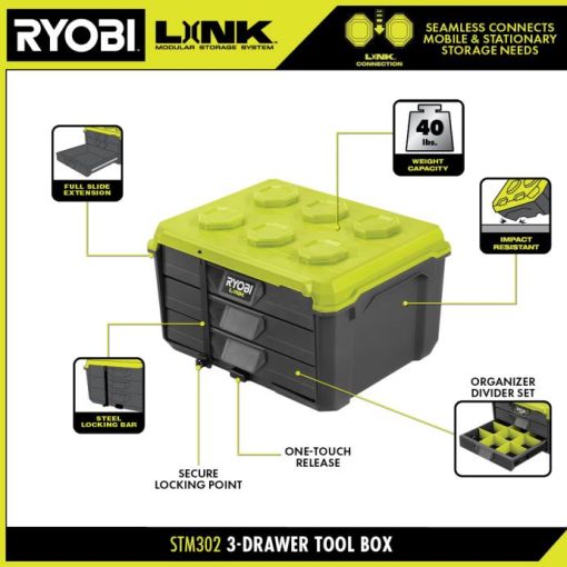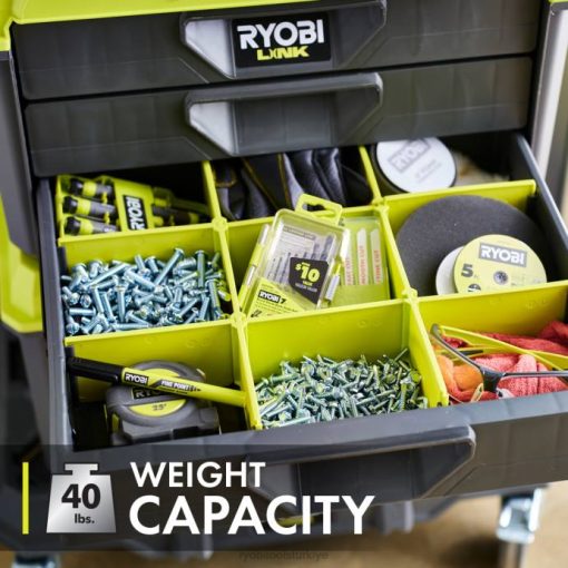 ryobi link modüler depolama sistemi, depolama endüstrisinde devrim yaratarak hayatınızı düzenlemenize, erişmenize ve taşımanıza olanak tanıyor. ryobi link 3 çekmeceli alet kutusu, en zorlu durumlarda aletlerin saklanmasını sağlar. Darbeye dayanıklı malzeme ve 40 lb. yük kapasitesi ile donatılmıştır. Taşınabilir alet saklama alanınızı, saklanabilir çelik kilit çubuğu ve güvenli kilitleme noktasıyla kolayca sabitleyin. tam uzatmalı kızaklar sorunsuz çalışma sağlarken, birlikte verilen düzenleyici bölücü seti, küçük parçaları yerlerinde tutarak maksimum ryobi alet depolama organizasyonu sağlar. herhangi bir ryobi bağlantısı mobil depolama öğesine sorunsuz bir şekilde yığın. bu, mobil alet kutusu serinize mükemmel bir eklentidir. hepsinden iyisi, aynı lo’yu kullanan Ryobi Link modüler depolama sistemi ürün serisinin bir parçasıdır.Mobil ve sabit depolama ihtiyaçlarınızı sorunsuz bir şekilde birbirine bağlayan teknoloji. ryobi link modüler depolama sistemi ile alanınıza sahip olun.