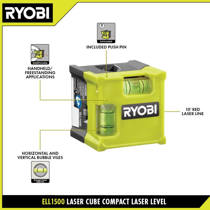 ryobi lazer küpü elde taşınır ve bağımsız bir lazerdir. boyutu, taşınabilirliği ve doğruluğu onu harika bir ev eşyası haline getiriyor. ryobi lazer küpü, doğru tesviye için yatay ve dikey kabarcık şişelerine sahiptir. Doğrudan yüzeyinize rahat ve kolay montaj için bir itme pimi dahildir. çıkarılabilir yapışkan şeritler (dahil değildir) lazer küpünü monte etmek için de mükemmel bir seçenektir.
