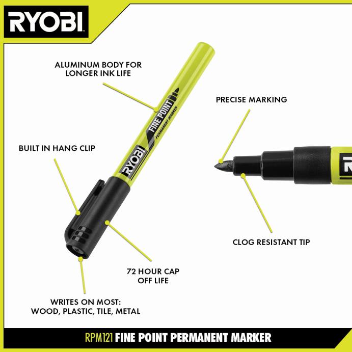 ryobi siyah ince noktalı kalıcı atölye kalemi çoğu malzeme üzerinde hassas, temiz işaretler sağlar. Bu işaretleyici, dayanıklılığı nedeniyle atölyeniz veya şantiyeniz için mükemmeldir. Yüksek kaliteli mürekkebi pürüzlü yüzeylerde rahatlıkla görülebilir. ortak yüzeyler arasında ahşap, plastik, fayans ve metal bulunur. işaretleyicide ayrıca kolay saklama ve erişilebilirlik için bir asma klipsi bulunur.